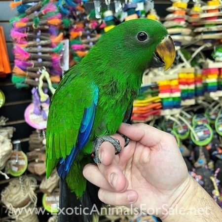 Currently hand feeding is a sweet baby Solomon Island Eclectus male. For more info call 773-317-3785.