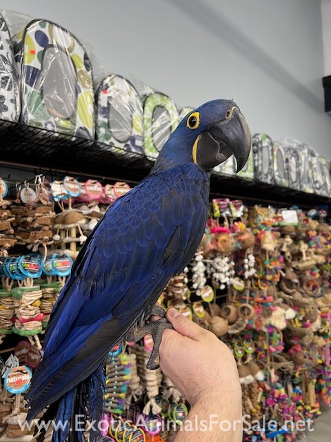 Hand fed very sweet and tame and ready for its forever home is a sweet baby Hyacinth Macaw. DNA is pending. WE DO SHIP!!! Please call 773 317 3785 for more info. ***CALL FOR PRICE***