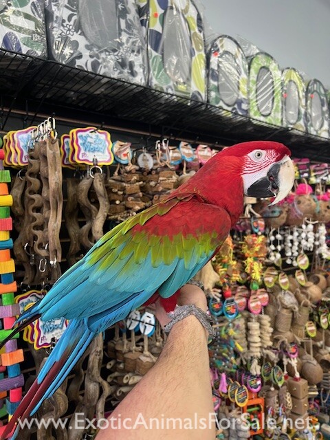 Very sweet and tame Say hi to "BELLA" she is a beautiful extra large Greenwing Macaw. WE DO SHIP!!! Please call 773 317 3785 for more info. ***CALL FOR PRICE***