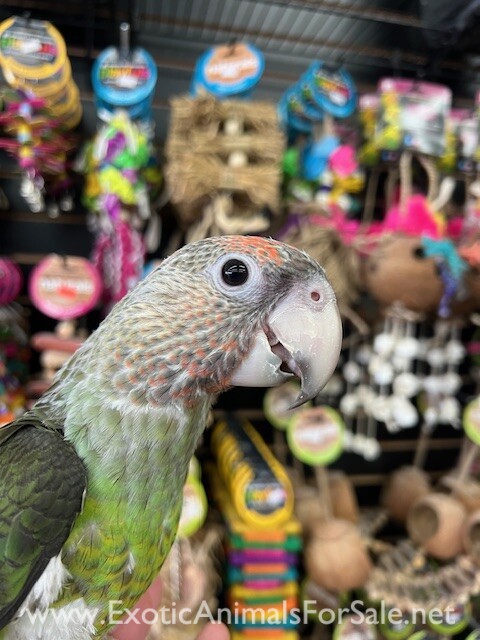 Semi tame 2024 hatch Cherry Head Conures available. They are very goofy and curious birds but they will need a little work to tame down. Call us for more info 773-317-3785.