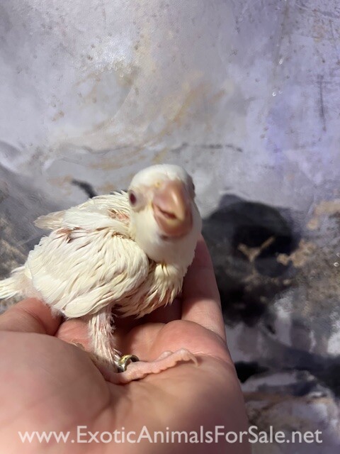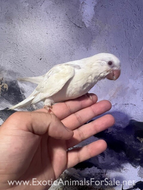Currently hand feeding is a sweet baby Albino Quaker Parrot, now accepting deposits to reserve. Call us for more info 773 317 3785.