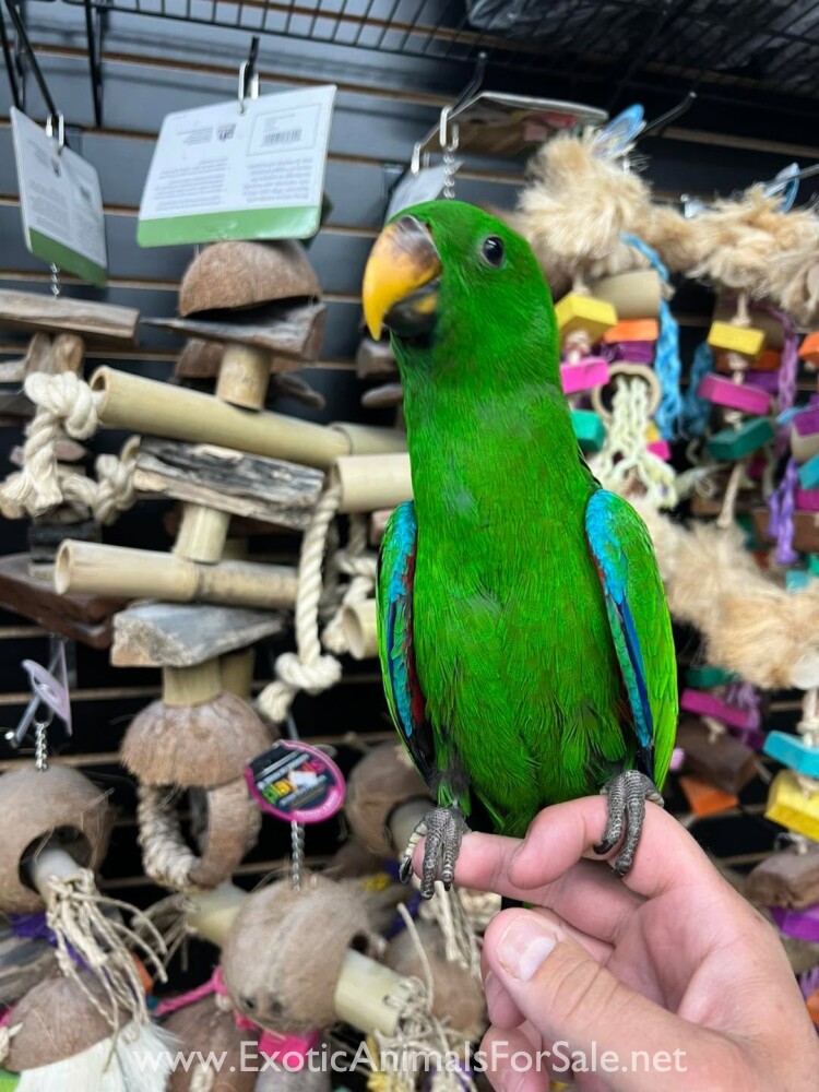 Just weaned and ready for its new home is a sweet baby Solomon Island Eclectus male. She is very sweet and friendly and loves to be cuddled. We offer financing go to birdmansparrots.com and apply today or call 773-317-3785.