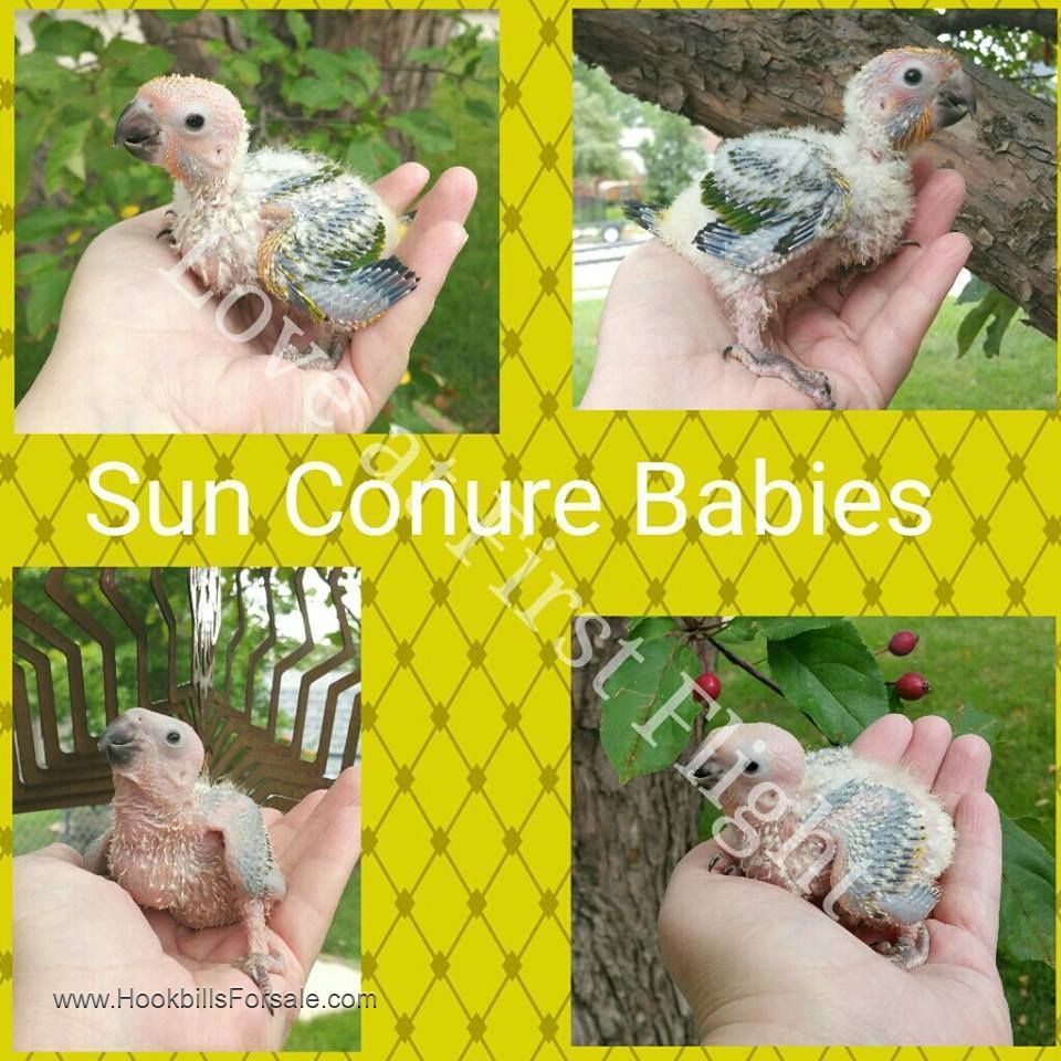 We are taking deposits on sun conure babies. They are $375 each and we ask for a $100 non-refundable deposit that goes toward the purchase price to hold your baby until it's weaned. We currently have 3 babies available for a deposit. All our babies a...
