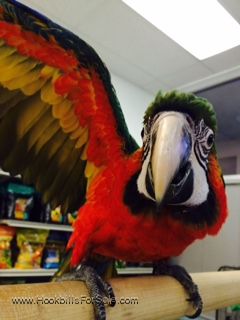 Baby Maui Sunrise Macaw available $2,200. Almost weaned 25% deposit holds the baby until weaned. Very sweet baby girl, she's a real cuddler. Serious enquiries only. Shipping available weather permitting. For more info call Brian at the Parrots Nest.