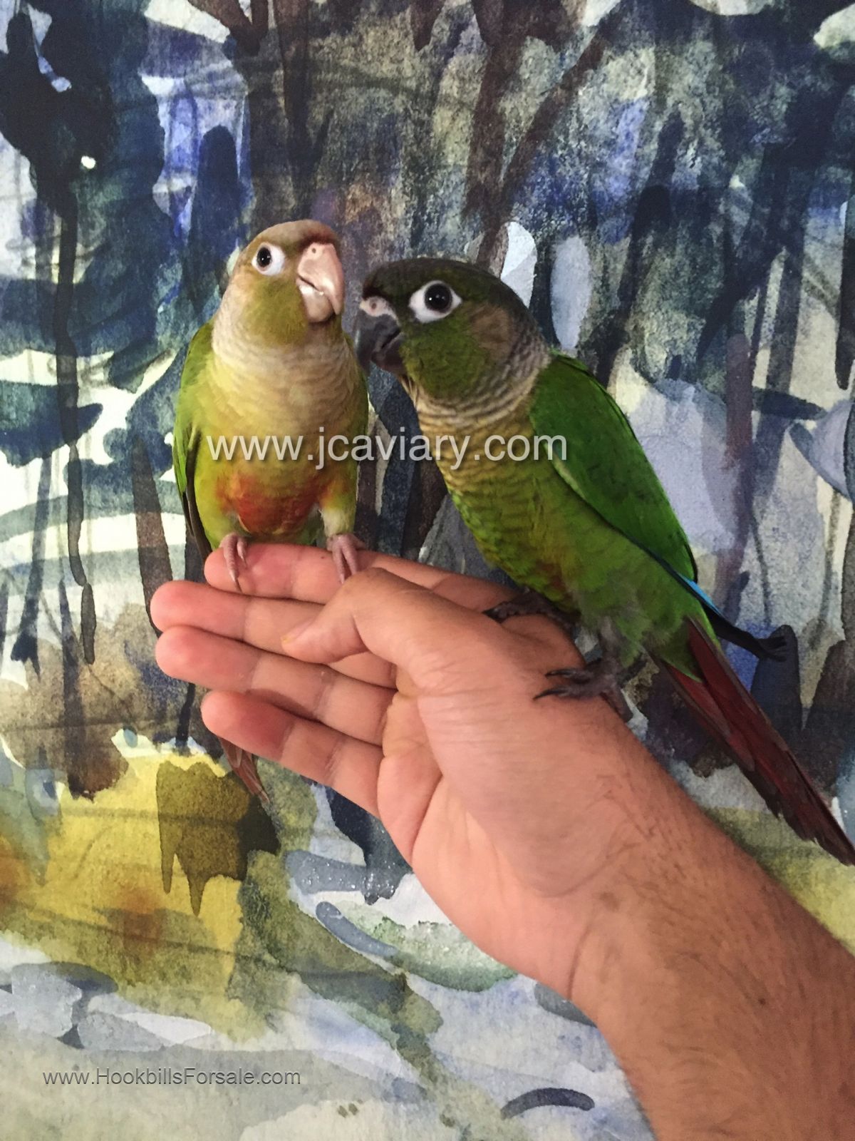 Baby green cheek conures ready for their new homes. These babies are fully weaned and eating on their own now. 12 weeks old currently. Visit our website for additional info and pictures of these babies.