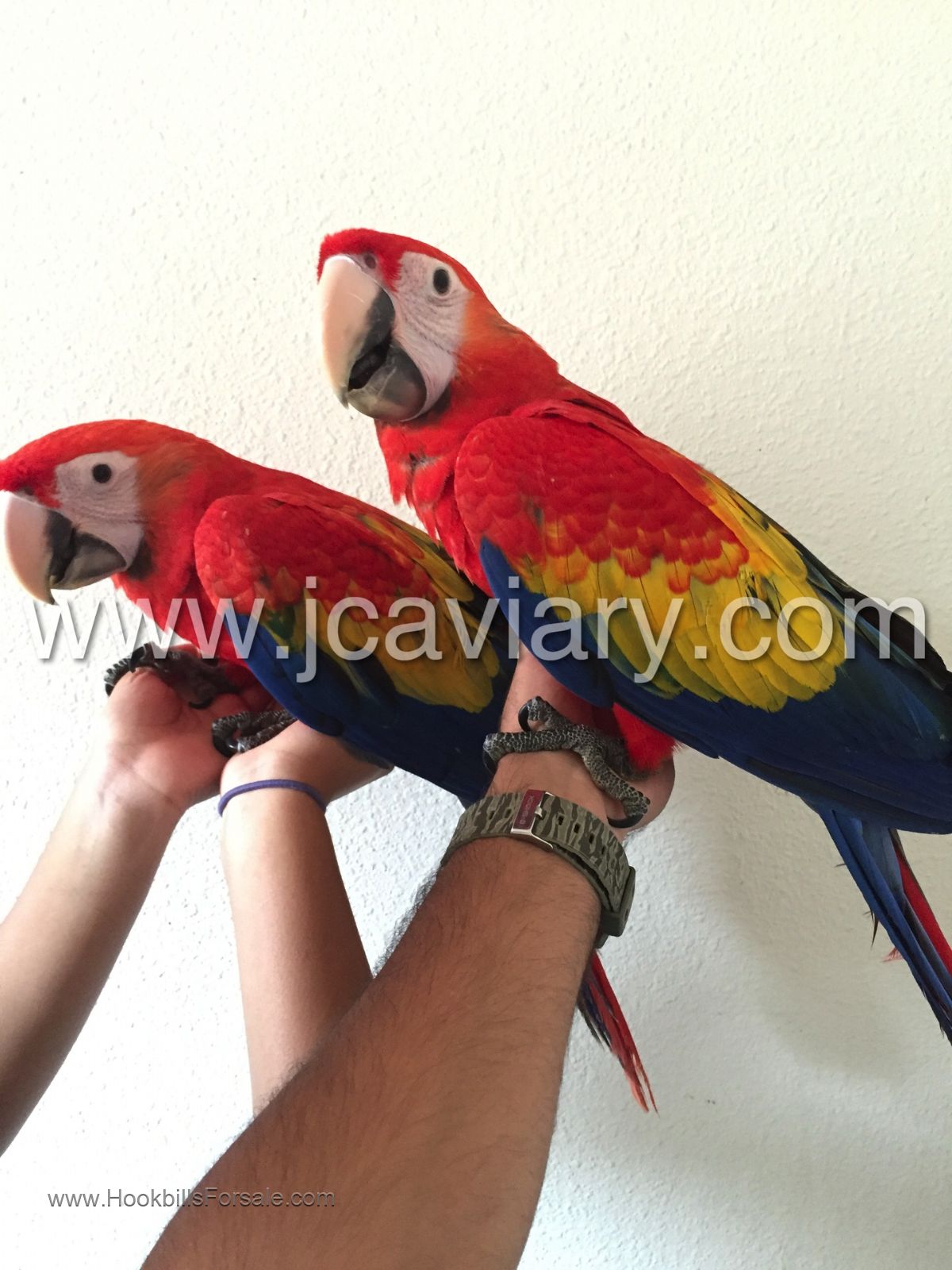 We have 2 beautiful baby Scarlet macaws available. These babies will be ready in July for pickup or shipping. Feel free to call or email us to reserve your baby! These babies will be weaned on fresh fruits/veggies and all pallet diet.