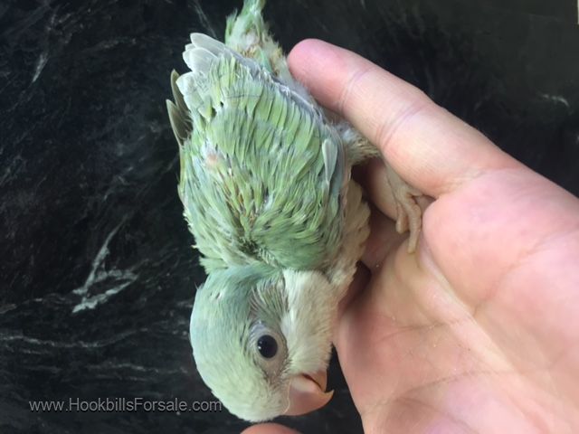 currently hand feeding is a sweet baby turquoise palid quaker parrot please call 773 317 3785 for more info visit us at birdmansparrots.com we are located at 5668 n Lincoln ave Chicago il 60659
