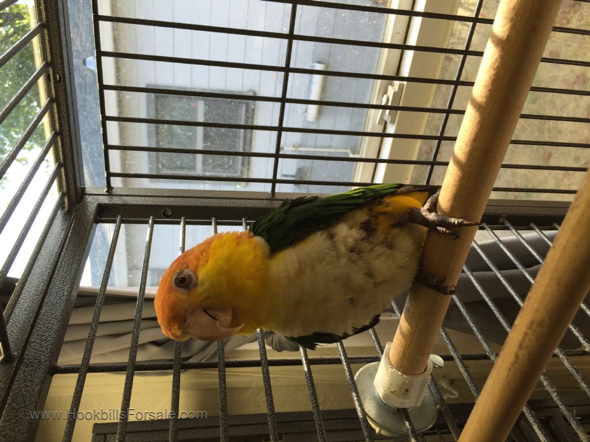 This male was separated from his mate/hen earlier this year. He was ready to breed and the hen was not so he became aggressive toward her. He is in perfect health on a pellet and quality seed mix. His legs are slightly plucked which is not uncommon as hormonal males come otni breeding season. He is closed banded and DNA sexed. He was originally bred in Oklahoma by Janet Sullivan: the band number is JLS OK 09 10. He was born in 2009 so he's at a prime breeding age.