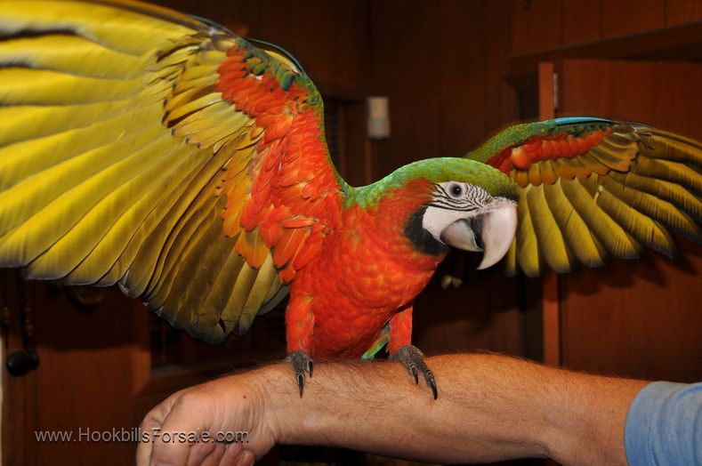 Sweet and smart baby Harlequin macaw. Dad is a Blue and Gold Macaw and mom is a Green Wing. Gorgeous colors. She is DNA sexed, hand raised, closed banded. She is fully weaned and ready to go. I prefer pickup but can ship via United. Please call for more information.