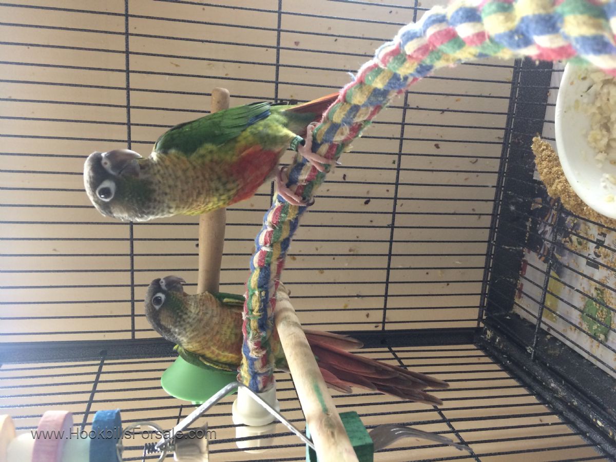 I have 1 four month old yellow side green cheek conure left. closed banded and raised by me. They are friendly and weaned onto Zupreem pellets and fresh fruits& veggies. For an additional fee I can verify their gender with DNA testing. $350 each. I do not deliver or ship. Thank you!
