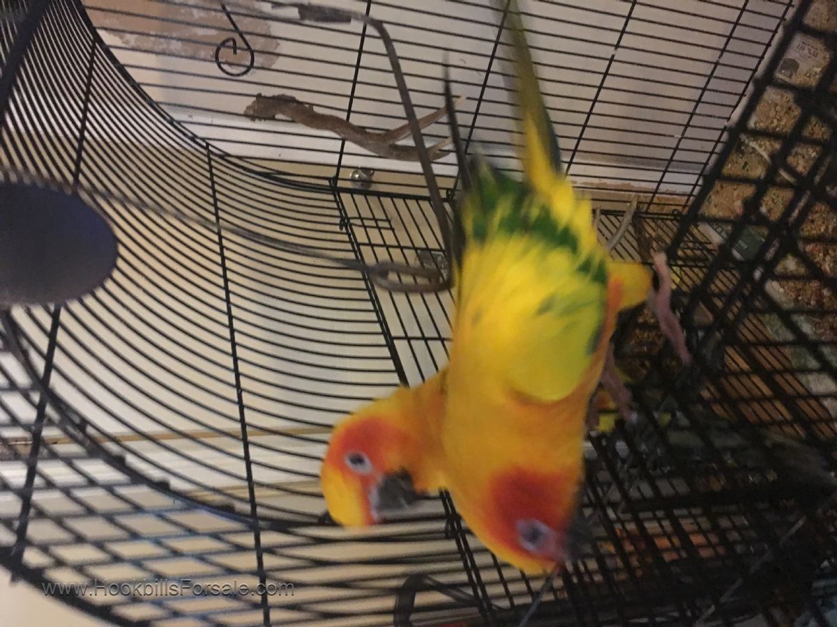 Two female sun conures turned 1 year old in august from the same clutch very sweet gorgeous birds I am gone a lot and don't give them enough attention