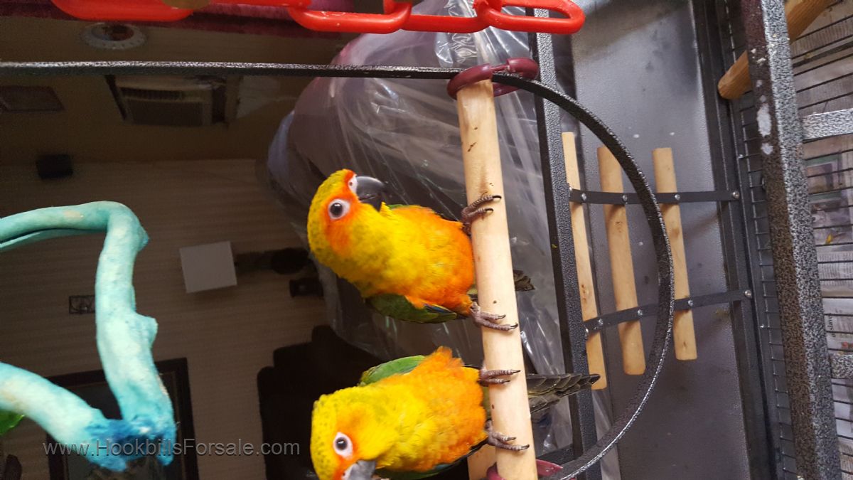 Hand fed weaned Sun Conures currently enjoying Zupreem Fruit Blend pellets. They are toy active, playful and love to cuddle. They were raised in my home around normal household noises, other pets and children. I am willing to travel within reason.
