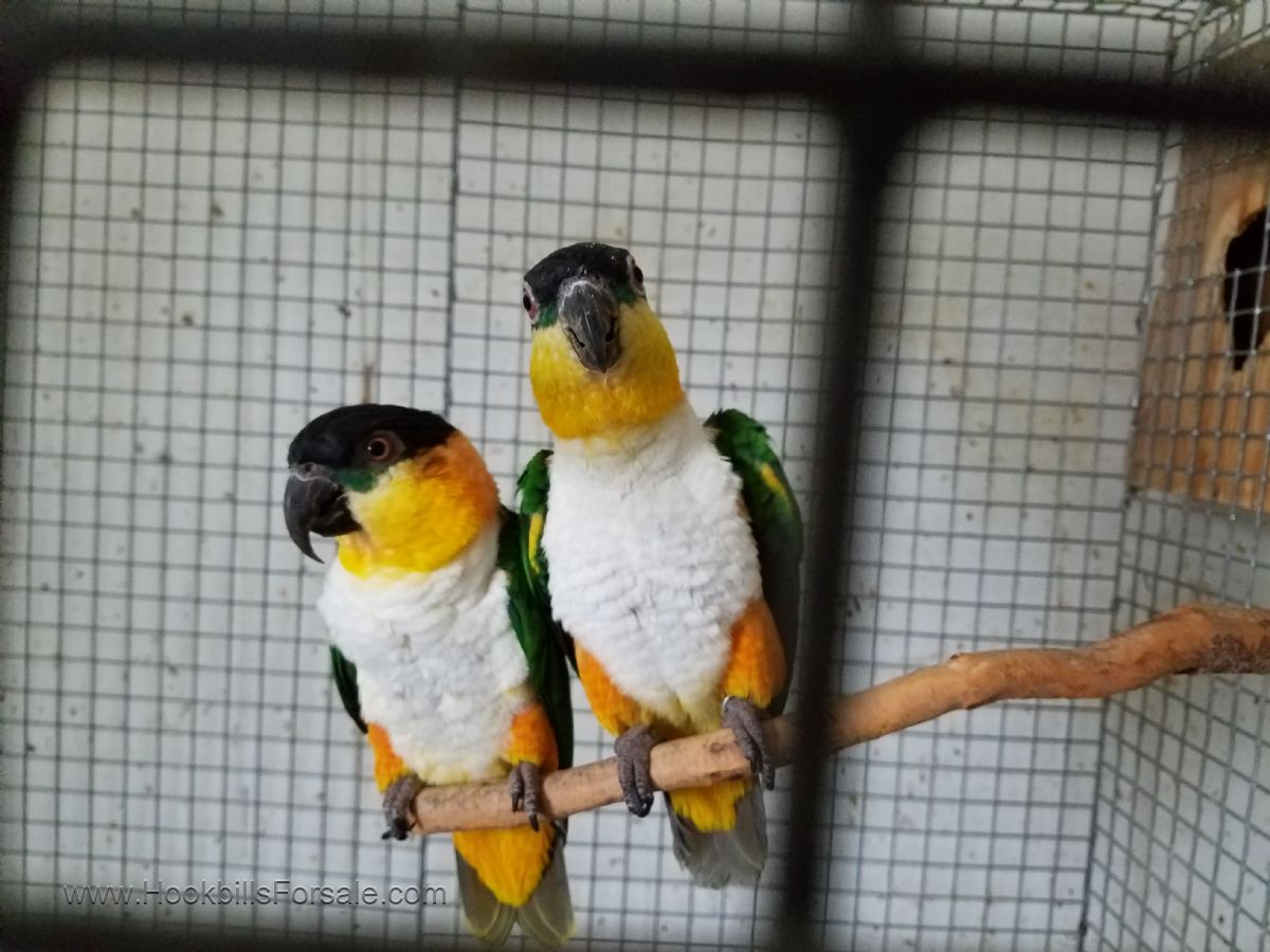 I thought they were sold, but things changed. 2 bonded unrelated BH caiques. One is proven and DNA sexed. The other is not. They sleep in their nest box every night. They are bonded but may not be a true pair. Not tame, not pets. Would be a great birds for someone interested in new bloodlines. $500. for both.