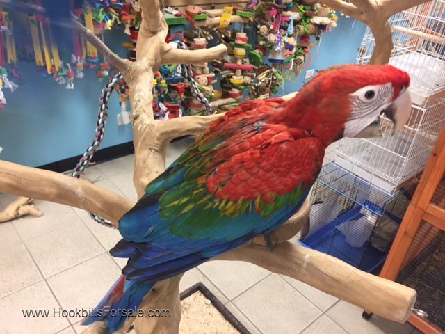 Hand fed sweet baby Ruby Macaw hybrid, we are located at 5668 n Lincoln ave Chicago, il 60659 please call 773 317 3785 visit us at birdmansparrots.com we do ship and we also offer financing go to birdmansparrots.com and apply now.
