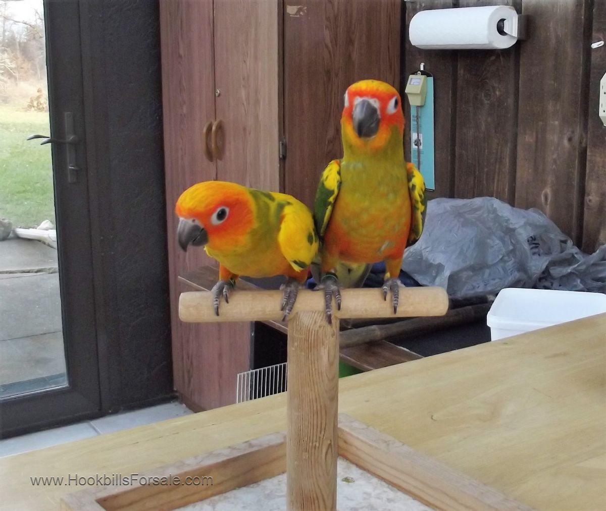 I have two unrelated, recently weaned Sun Conures to sell. They were hatched in October, 2016 and are closed banded. They are also DNA tested (male & female). They can be handled and make great pets. Price is $375.00 for one. Any questions call, text or email. Thanks for looking.
