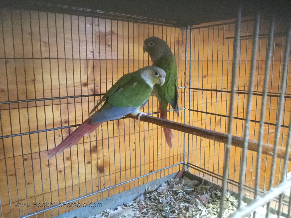 Unproven pair of green cheek pineapple conures for sale here in North Carolina, Madison, 27025, no shipping. Male is approx, 7 yrs old the female about 5. They have been together about 4 years and get along well, The female is plucked and under weight. I can't seem to find food that she likes. I am not separating these birds. I paid over a thousand for them. I am asking $750 for the pair.