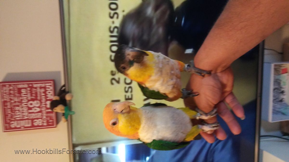 1 beautiful pair of caiques available both are tammed, banded Beautiful birds. Male is black headed , female is yellow thigh. Willing to trade for 2 African grays banded. $1650
