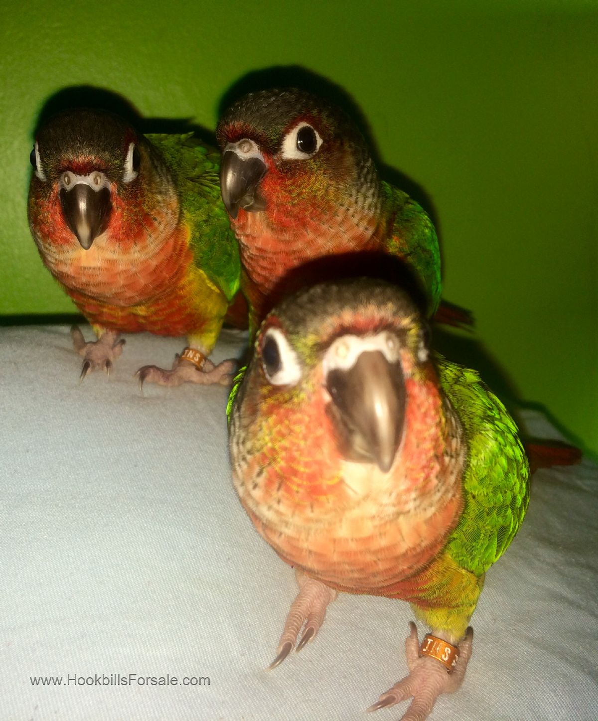 I have three Hand Raised high red yellow sided green cheek conures that are now fully weaned. All are closed banded, super red, and super sweet. They come with hatch certificates, a health guarantee, and a baby picture. My babies are handled every day and very sweet. I wean them onto zupreem pellets and fresh fruits & vegetables.