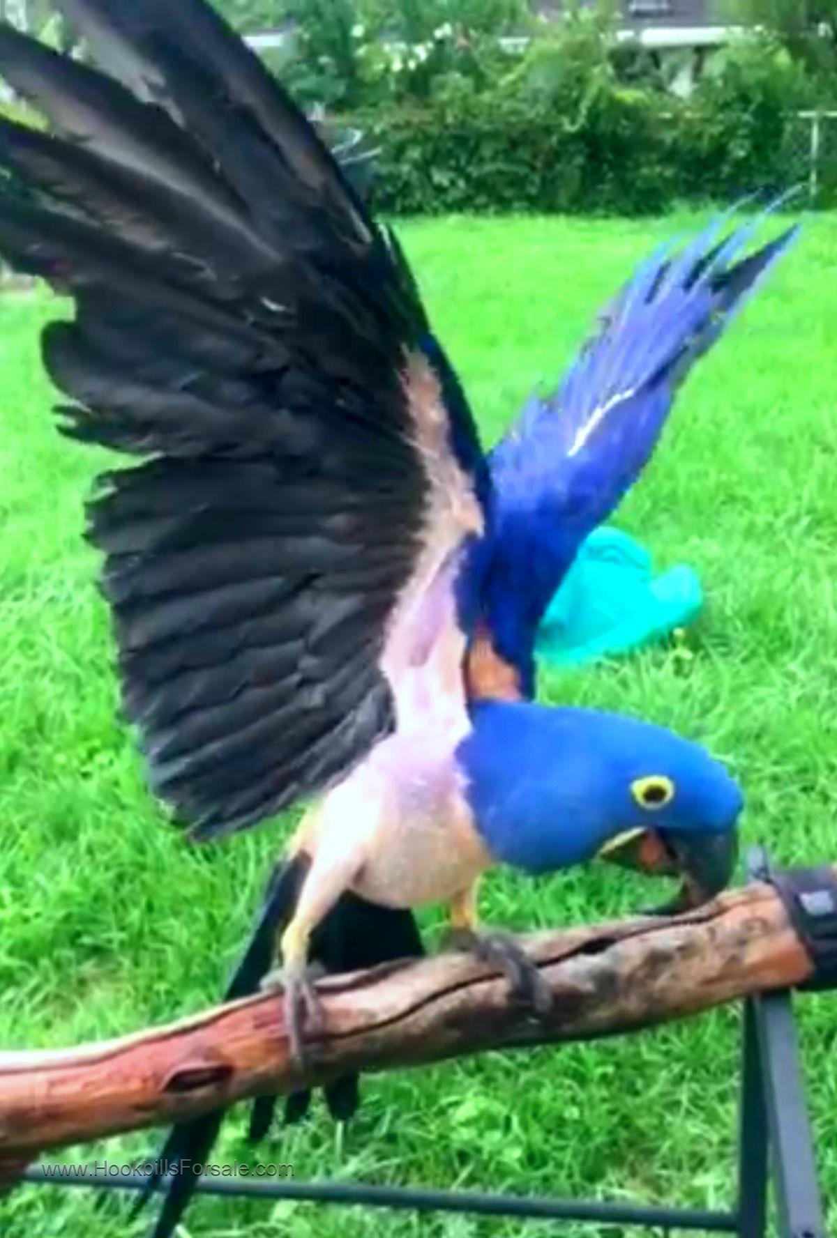 Hyacinth macaw- unbelievably friendly 12 year old boy, has been used in educational programs has never bitten a single person. When he was younger he plucked his chest and abdomen but his wings, tail, and head are immaculate he no longer plucks and is one gorgeous boy. He speaks very well for a hy especially, lays on his back like a baby, hides his face with his wing and says peekaboo. He was paired with a friends female and produced 3 chicks out of 2 clutches before she kept one of the babies and sold her female.