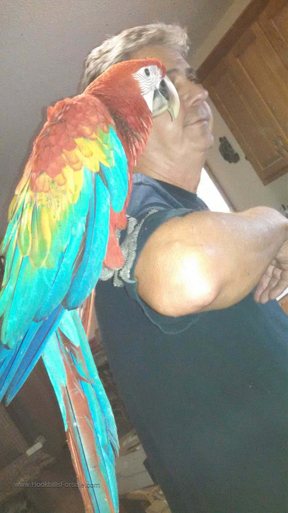 We have available one gorgeous hand fed Ruby Macaw Chick. Father is a large Scarlet, the hen is a large Green Wing Macaw. This chick was DNA sexed as a hen, hatched 6/29/17. She is still being hand fed and is available now. Shipping is available at the buyers expense.