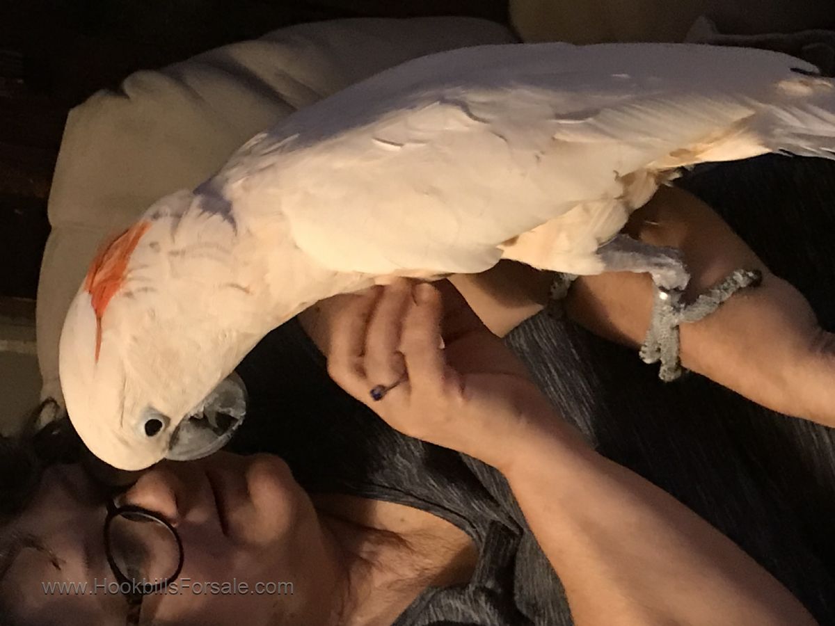 Peaches loves to be hugged and scratched under his wings. He’s very good about having his talons clipped. He’s fully flighted, though he chooses not to fly an whole lot.