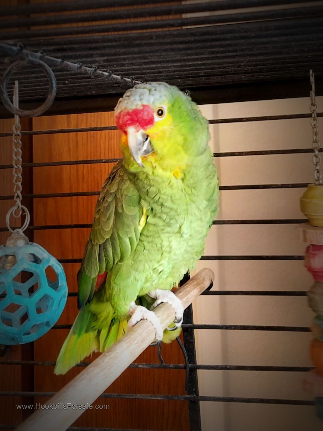 Red Lored Amazon. 27 years old. Born in Brookings Oregon. Talks, sings and mimics lots of sounds. Wife developed serious respiratory condition. Dr. said no pets in the house. With much regret Kiko has to leave. Cage included.