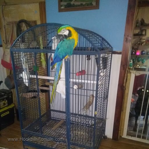 9 year old B&G Macaw, needs new home. He needs more time out of his cage. I have too many dogs for him to be out as much as he need He is not afraid of the dogs and I am afraid he will get hurt. He talks, hello, goodbye welcome, and he barks. He loves to be petted and sit on your shoulder. He dances. He comes with his cage and toys. No shipping, pick up only. I am asking $900