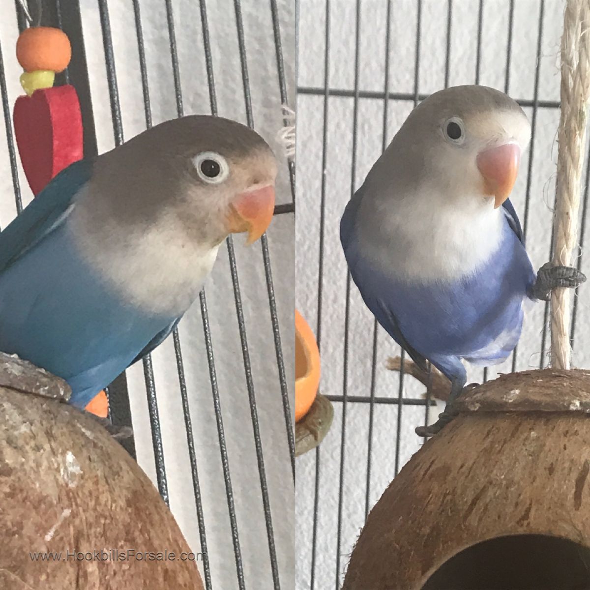 Two male Fischer’s Lovebirds (blue mutation) for sale. Hatched 1-3 of November of 2017. Parent-raised but some what tame and can easily be trained. One is a dark phase male with a light head and the second on is a lighter phase with a darker head. Super adorable personalities would be good as a breeder or a companion.