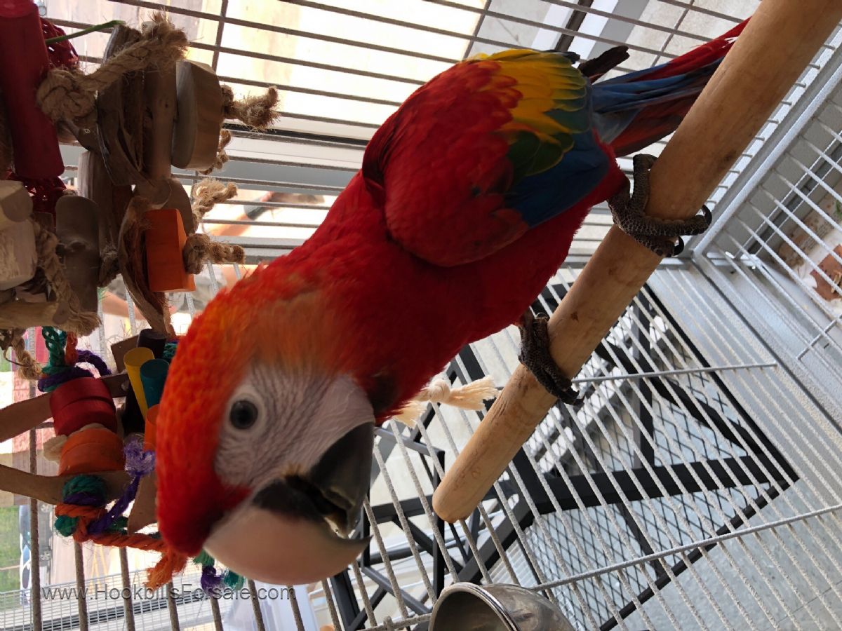Hand raised baby scarlet macaw. Hatched 01/18/18. DNA female. She’s very sweet and curious. She’s leery of strangers but after a head rub or giving her a treat she warms right up. Looking for her forever home. She’s currently available at Bert’s Pet Center in Ashland, Kentucky. Please contact the store at (606)325-4205 or the breeder, The Psittacine Hatchery, at (606)694-9776 or psittacinehatchery@icloud.com if interested.
