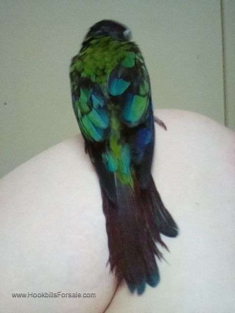 Sweet little cuddle bug! Talks some. Says people,bad bad, what, yeah, an eclectus noise, pretty bird and is mumbling something new in his little fairy voice. He is being taught step up and very happy with attention. He is on sale for $675.