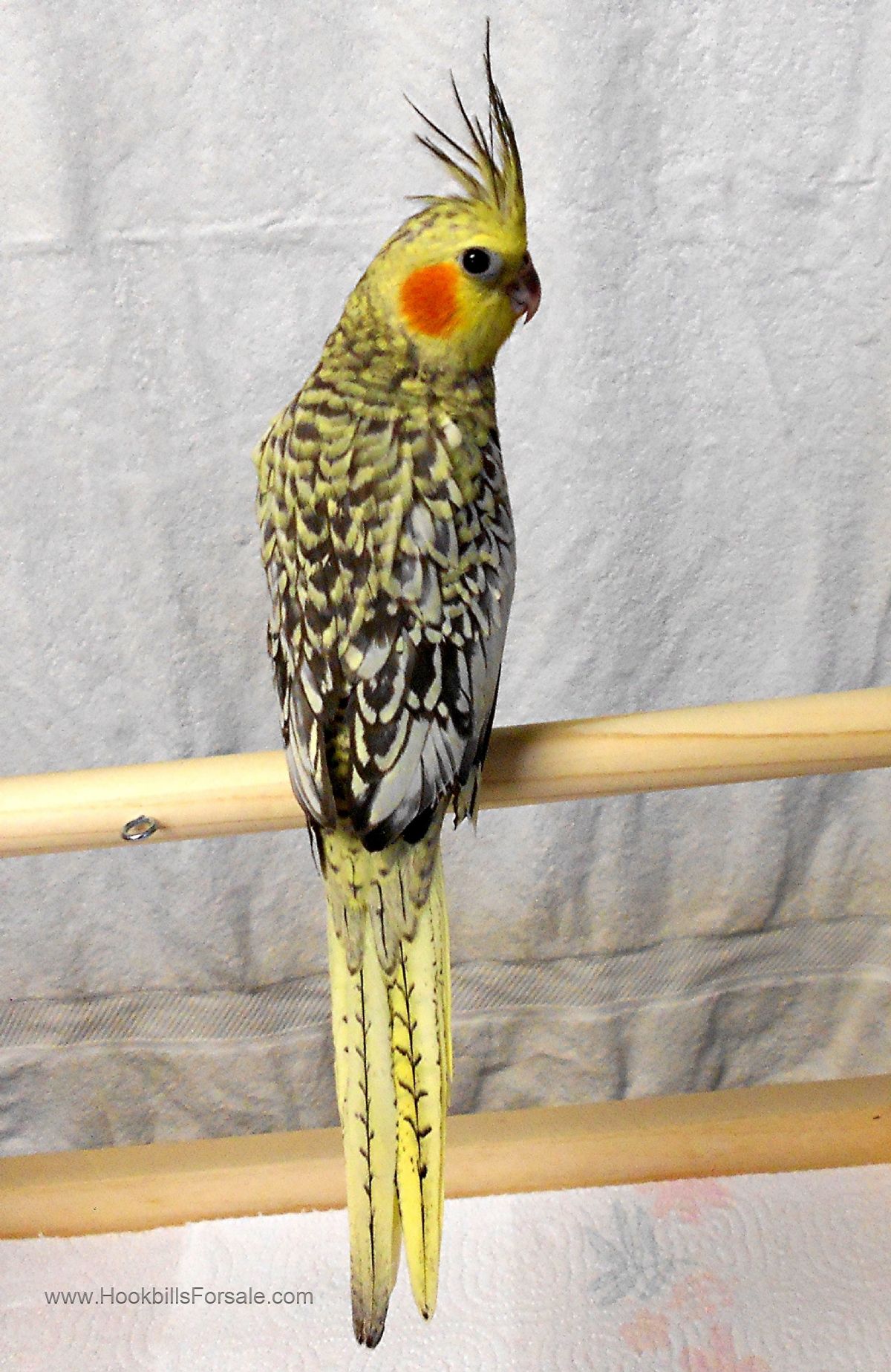 Beautiful rare mutation, Golden Cinnamon Pearl Lacewing Cockatiel. She has deep yellow scalloping against a cinnamon background, She has been hand fed, trained to step up, sits on the shoulder or a perch outside the cage on her own. Very loving and not a fussy bird. She loves to perch on her own and watch tv or just peer out the window. She is a very independent young lady and plays well on her own but also enjoys attention. I train all my birds to be good companions. Hatched 6/11/18 and ready to go to good home. Although she is a female, she loves to whistle and chatter and tries to mimic. Please visit my web page for more photos and information.