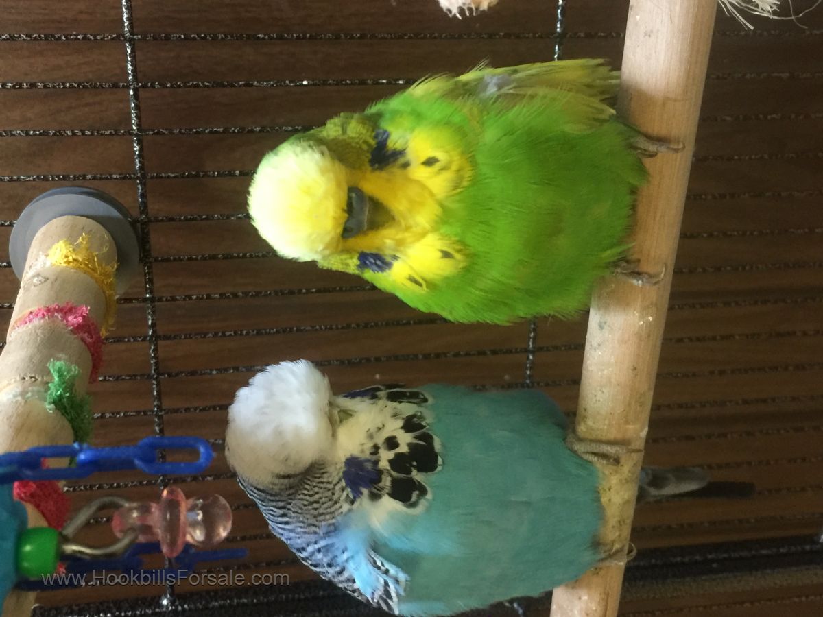 I am selling my two BEAUTIFUL English Budgies. The heads on these two are so large. The blue female is 1 years old and the green male is 5 years old. I am asking 120 which includes their cage. Without the cage I would like 100 for them