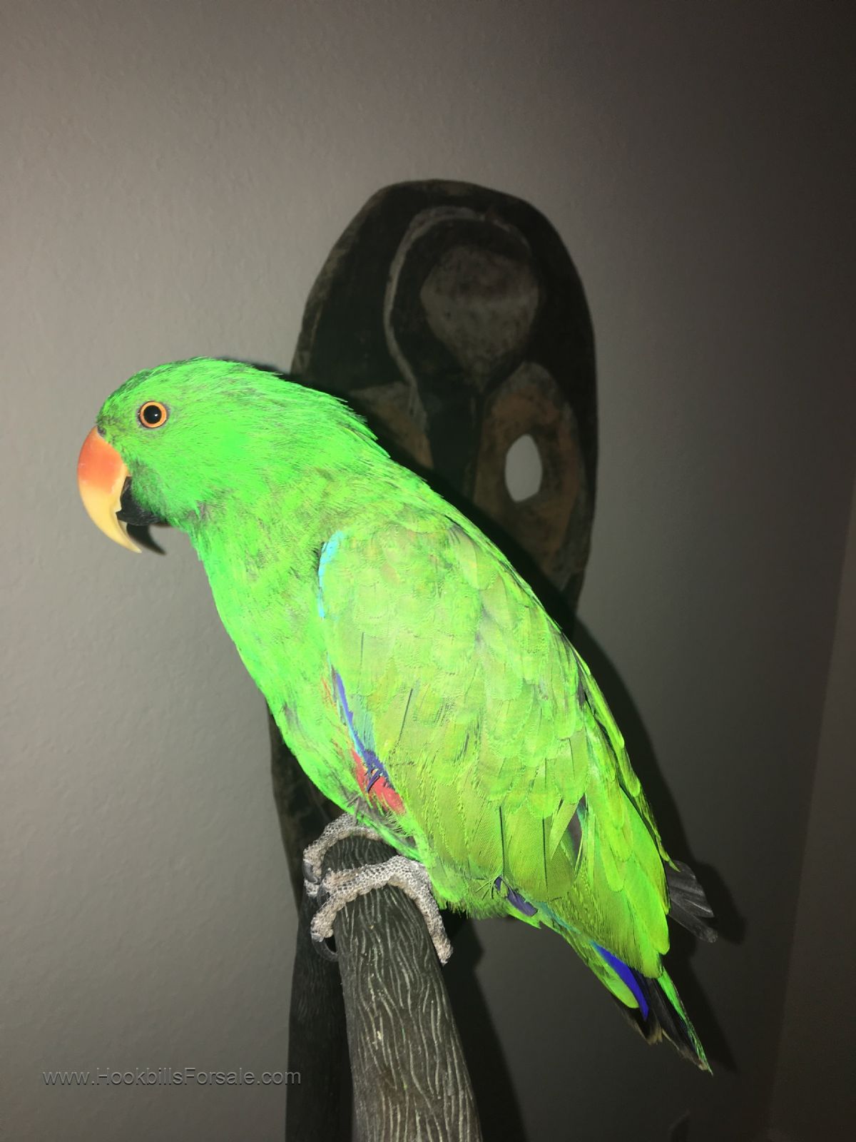 Wasabi is a sweet, affectionate young Eclectus who is very attached to his human 'flock.' He is comfortable with all members of the household including other pets, however he seems to prefer the ladies of the house. He says a minimum number of words, but loves to chatter and sing in the mornings outside on his perch. He often mimics other birds he hears outside, too. He is a healthy, good eater who enjoys sharing meals and relaxation time with his humans. He loves to perch on your shoulder and take rides in the car. He is most content just to be perched in the same room where you are.