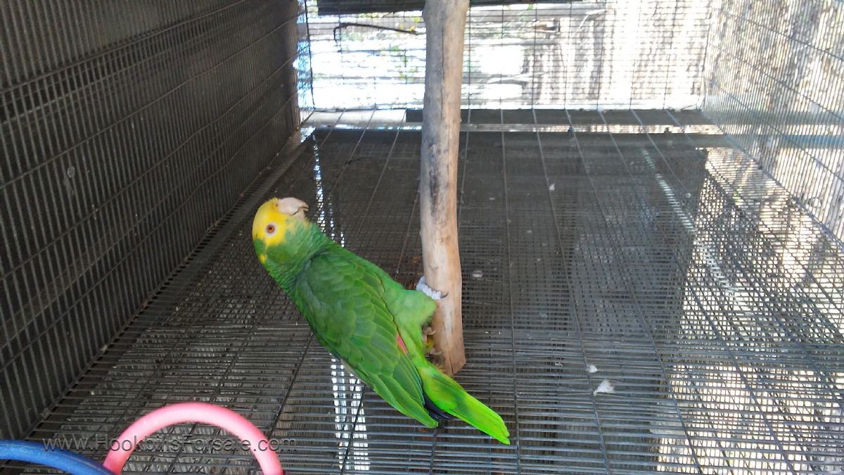 Female double yellow head amazon parrot. Not tame but will let you approach her while in the cage. Says some words. Don't know her age fot sure, but thinking that she must be over 20 years old.