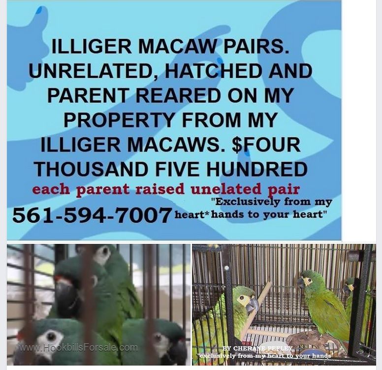 The Illiger Macaws pairs are unrelated to one the other and pulled at eight months of age.