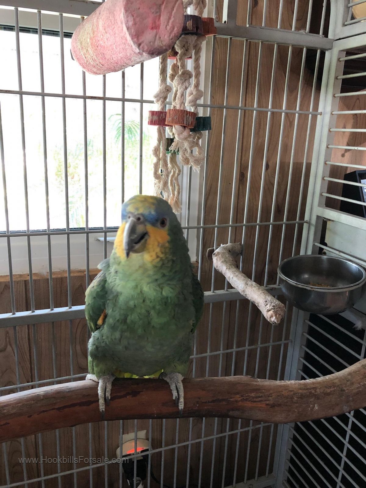 Friendly orange wing amazon, tame with both female and male. He does talk a bit, says his name Walter, 13 years old, believed to be a male, is not a plucker. He does not need a lot of attention, self entertains himself. Comes with large cage and toys. $850