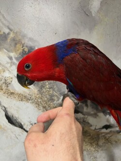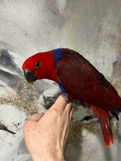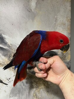 Currently hand feeding is a sweet baby Solomon Island Eclectus Parrot female. WE DO SHIP!!! We offer financing go to birdmansparrots.com and apply today or call 773 317 3785.