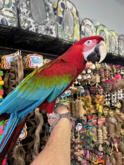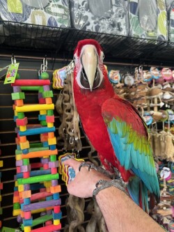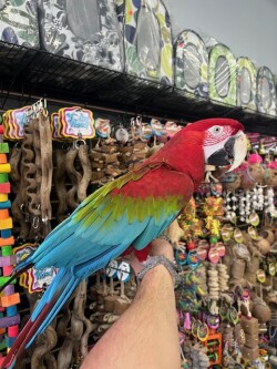 Very sweet and tame adult say hi to "BELLA" she is a beautiful large Greenwing Macaw. WE DO SHIP!!! We offer financing go to birdmansparrots.com and apply today or call 773 317 3785.