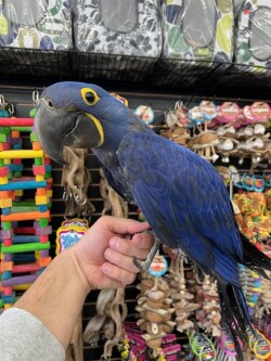 Hand fed very sweet and tame and ready for its forever home is a sweet baby Hyacinth Macaw. DNA tested male. WE DO SHIP!!! Please call 773 317 3785 for more info. ***CALL FOR PRICE***