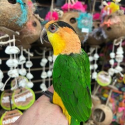 Very sweet and tame playful Hybrid Caique which is a Black Headed Caique and a White Bellied Caique cross. WE DO SHIP!!! We offer financing go to birdmansparrots.com and apply today or call 773-317-3785.