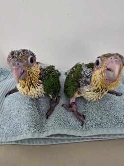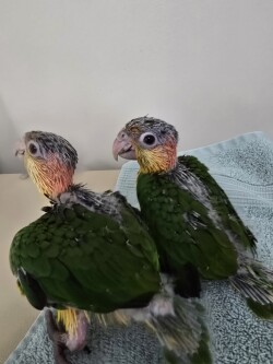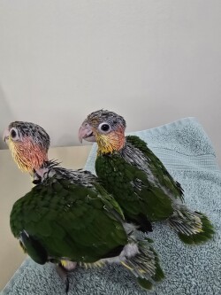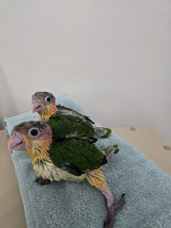 Caiques are one of the most popular pet birds. They have vivid plumage, stunning green, white, yellow and bright orange. They are fun loving playful clowns. Becoming a family member quickly. Our babies are hand fed and socialized from the moment they hatch. Very sweet babies.