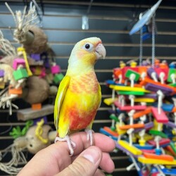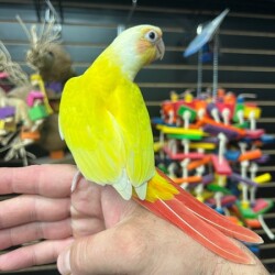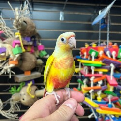 Just weaned is a sweet baby Sun Cheek Green Cheek Conure. We offer financing go to birdmansparrots.com and apply today or call 773-317-3785.