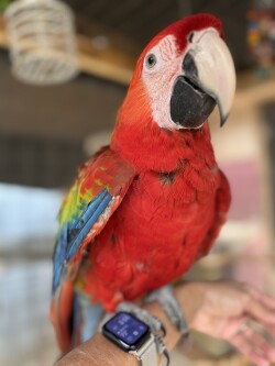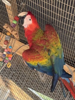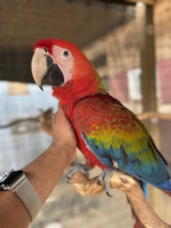 Beautiful Baby Macaw High Red Hybrid Capri, Male available. $6500, now weaned. He is a beautiful, friendly bird. He is banded, sexed and disease tested.