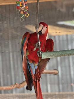Capri is a cross between a Camelot & a Scarlet macaw. A Camelot is a 2nd generation hybrid cross of a Catalina (Scarlet x Blue & Gold Macaw) to a Scarlet Macaw. Color variation varies, but these babies will have some beautiful red, orange and yellow tones.
