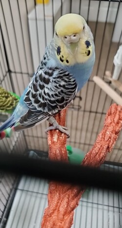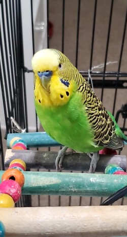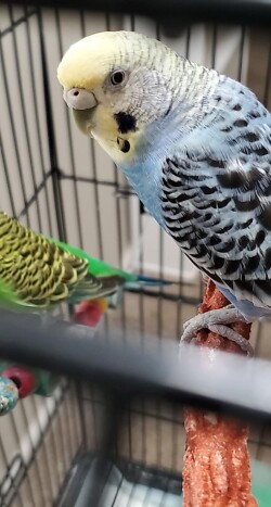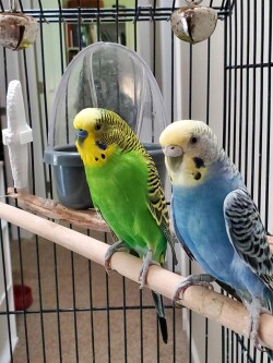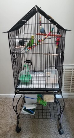 This bonded pair of budgies is a lot of fun, but I have too many birds to take care of them all. They are adults, but am unsure of their exact ages. The blue is a female and the green is a male. Both are very active and playful; the male is more friendly and chatty than the female, but the female loves to play with her beak and forage. This is the cage they came with; It's very heavy duty, but has one wheel that needs to be screwed in better or it can fall off when the cage is being rolled. I will include the perches you see in the cage and a feeder and waterer.