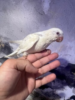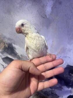 Currently hand feeding is a sweet baby Albino Quaker Parrot, now accepting deposits to reserve. Call us for more info 773 317 3785.