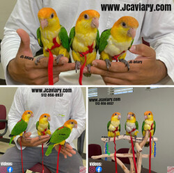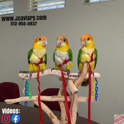Incredibly sweet, tame, hand-fed and trained white bellied caique babies ready now for their forever homes. These babies are weaned on a healthy diet of organic pellets, veg and mixed nuts. All our babies are sweet and very socialized. Please see our website 4 detailed info! For inquiries please call-- 512-956-0937