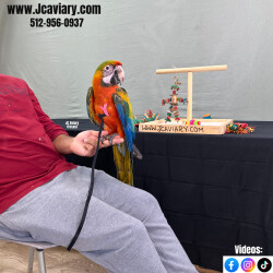 Incredibly sweet, tame, hand-fed and fully trained camelot macaw baby ready now for her forever homes. She is weaned on a healthy diet of organic pellets, veg and mixed nuts. All our babies are sweet and very socialized. Please see our website for detailed information! For inquiries please call-- 512-956-0937