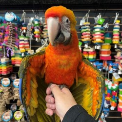 Currently hand feeding is a sweet tame baby Camelot Macaw Yellow Dom Hybrid. This beautiful baby has lots of beautiful colorful feathers and already saying hello. Call us for more info 773-317-3785.