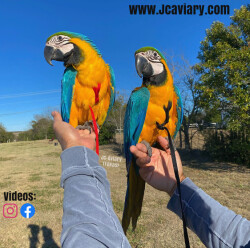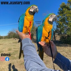 Accepting reservation on these 2 adorable blue and gold macaw babies. They are still being hand-fed and fully trained by us as well. They will be on a healthy diet of organic pellets and vegetables. All our babies are sweet and very socialized. Please see our website for detailed info! For all inquiries please call-- 512-956-0937